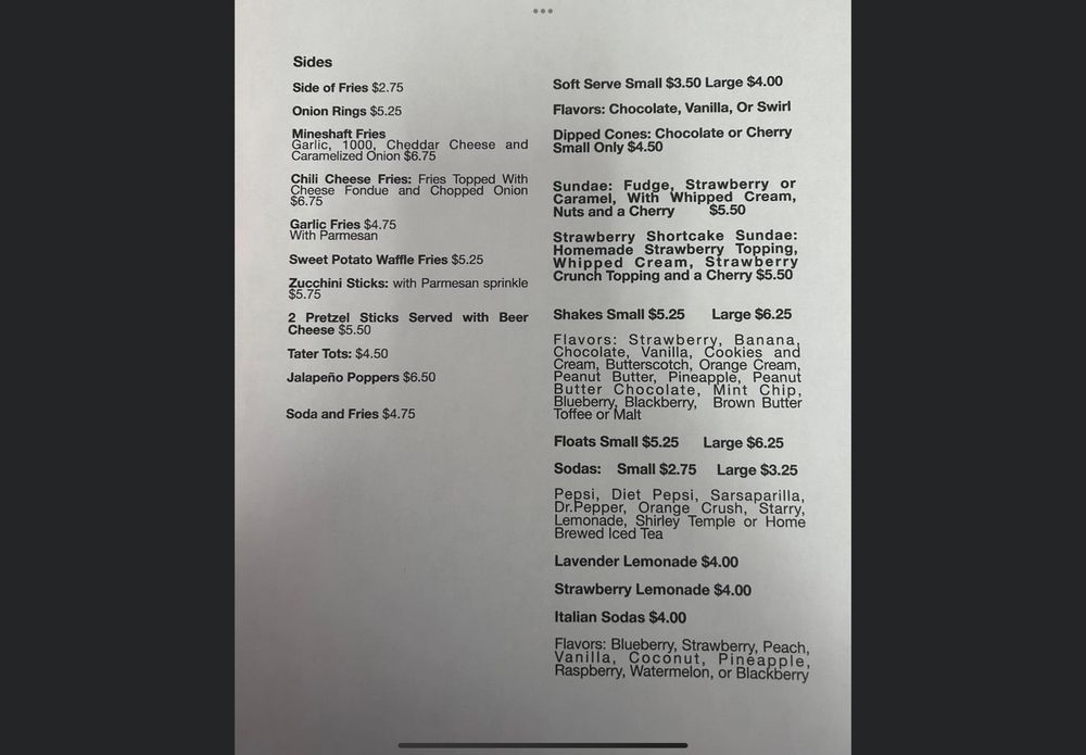 Fries, fried zucchini, onion rings, garlic fries, house salad, mineshaft fries, chili cheese fries, sweet fries, or no side.