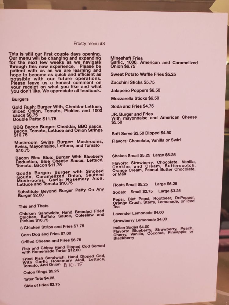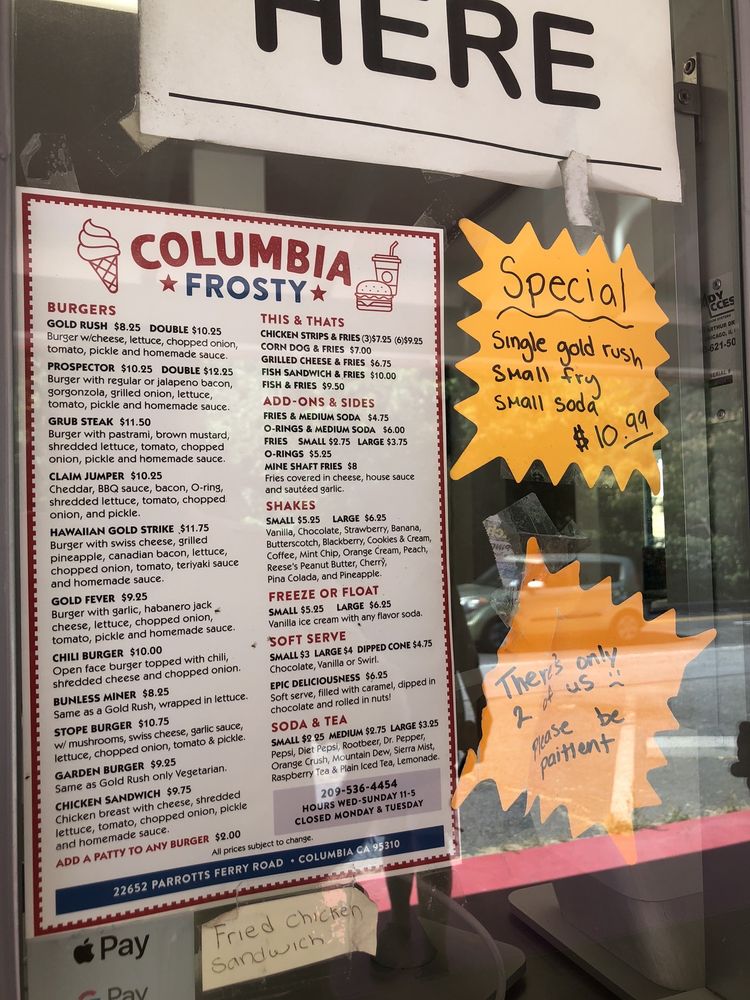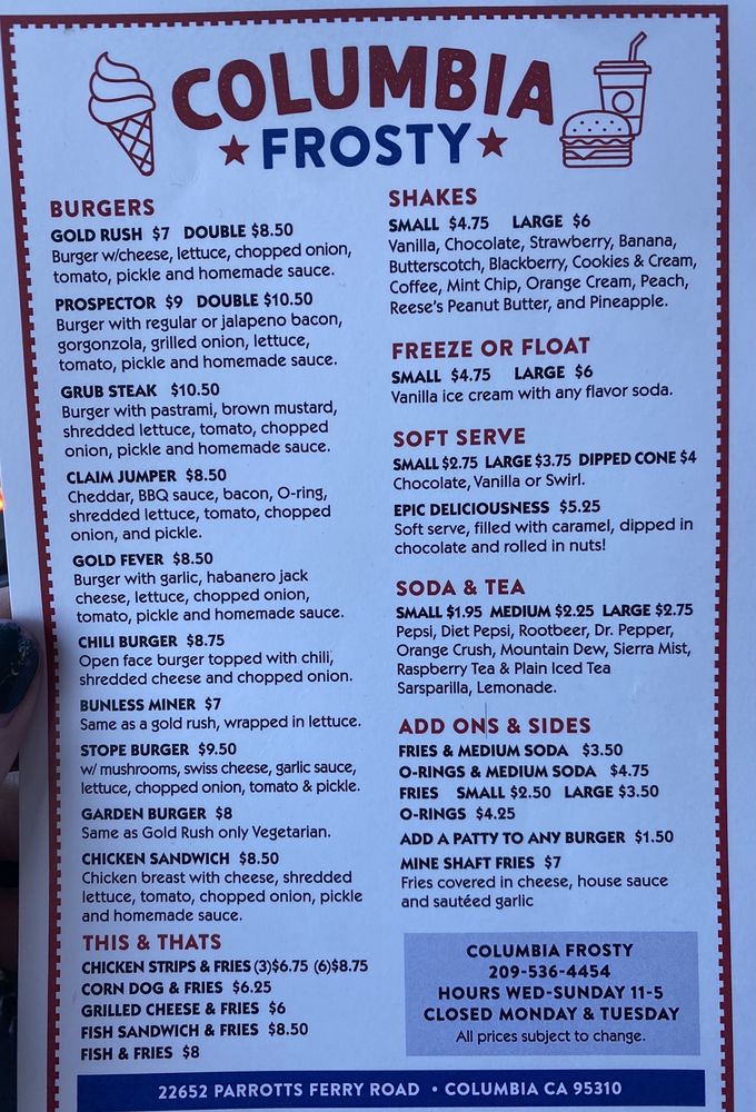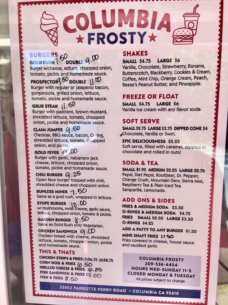 Introducing Columbia Frosty, a charming spot in Columbia, CA, offering a delightful menu of ice cream, frozen yogurt, burgers, and sandwiches. With a classy ambiance and private parking, this establishment has won the hearts of many customers. Reviews rave about the quality of meat used, the addition of beer, and the friendly service provided by the staff. Highlights include the grilled ham and cheese, zucchini fries, milkshakes, Gold Rush burger, and Bacon-Blu burger. The outdoor seating area under twinkling lights adds to the cozy atmosphere. The new owners have elevated the dining experience, introducing delicious weekly specials and reliable soft serve treats. Despite a few hiccups like long wait times and slippery floors, Columbia Frosty remains a favorite for its juicy burgers, crispy fries, and attentive service. Make sure to try their famous shakes and enjoy a satisfying meal at this quaint roadside diner.